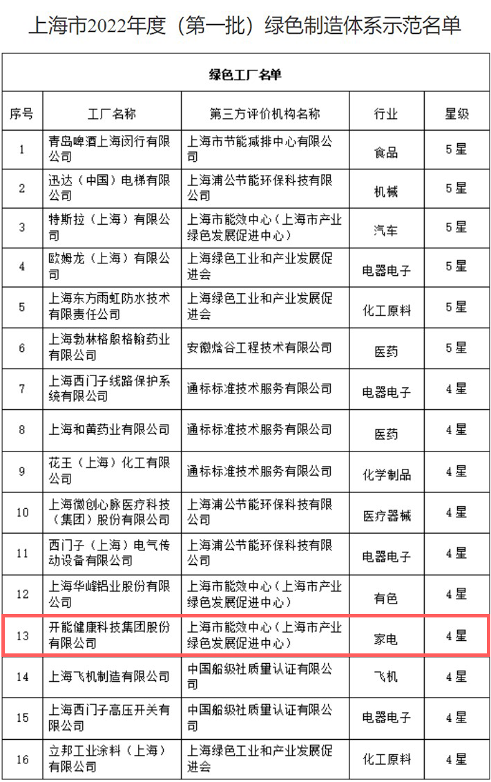 日前,上海市2022年度(第一批)綠色制造體系示范名單出爐,開能健康科技集團(tuán)股份有限公司(以下簡稱“開能健康”)榜上有名。